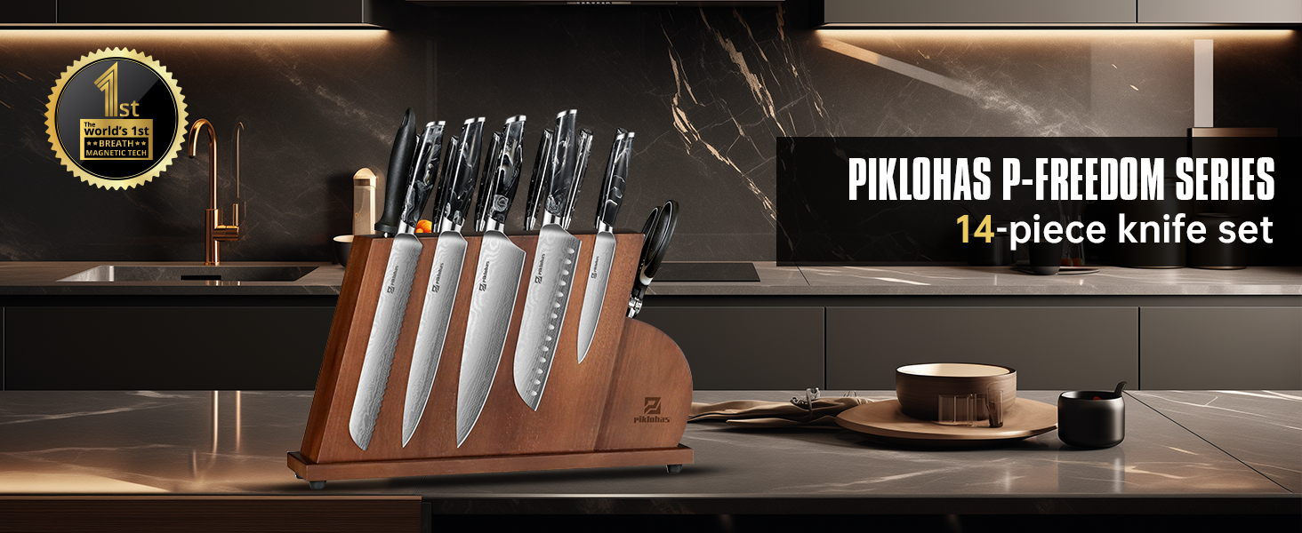 Every knife you could ever need, built to last a lifetime. 14 Pieces Knife Set for Kitchen with Magnetic Block, Razor Sharp High Carbon German Stainless Steel Damascus Pattern, Full Tang Ergonomic Handle, Black Flowing Cloud Design Ideal for Gift.