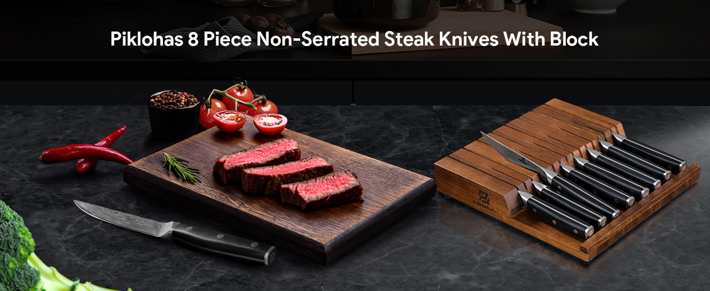 Cut Through Everything Effortlessly: Piklohas Non-serrated steak knives have a sharp, straight edge that allows for clean and accurate cuts through steak and other meats without tearing or shredding meat. That minimizes the loss of natural juices from the meat. This helps maintain the steak's flavor, tenderness, and overall quality.